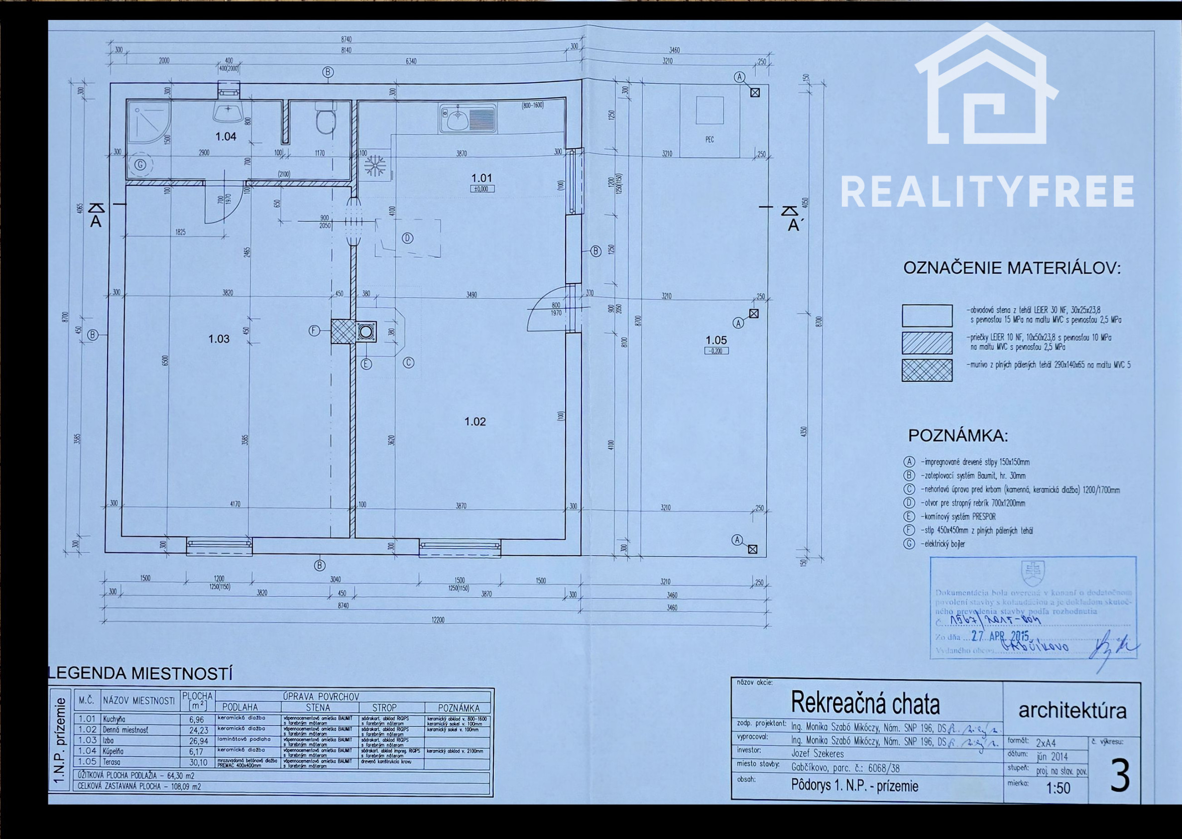 Dispozícia: vstup - kuchyňa 6,95 m², denná miestnosť 24,23 m², Izba 26,24 m², kúpeľňa s WC + technická miestnosť 6,17 m²,